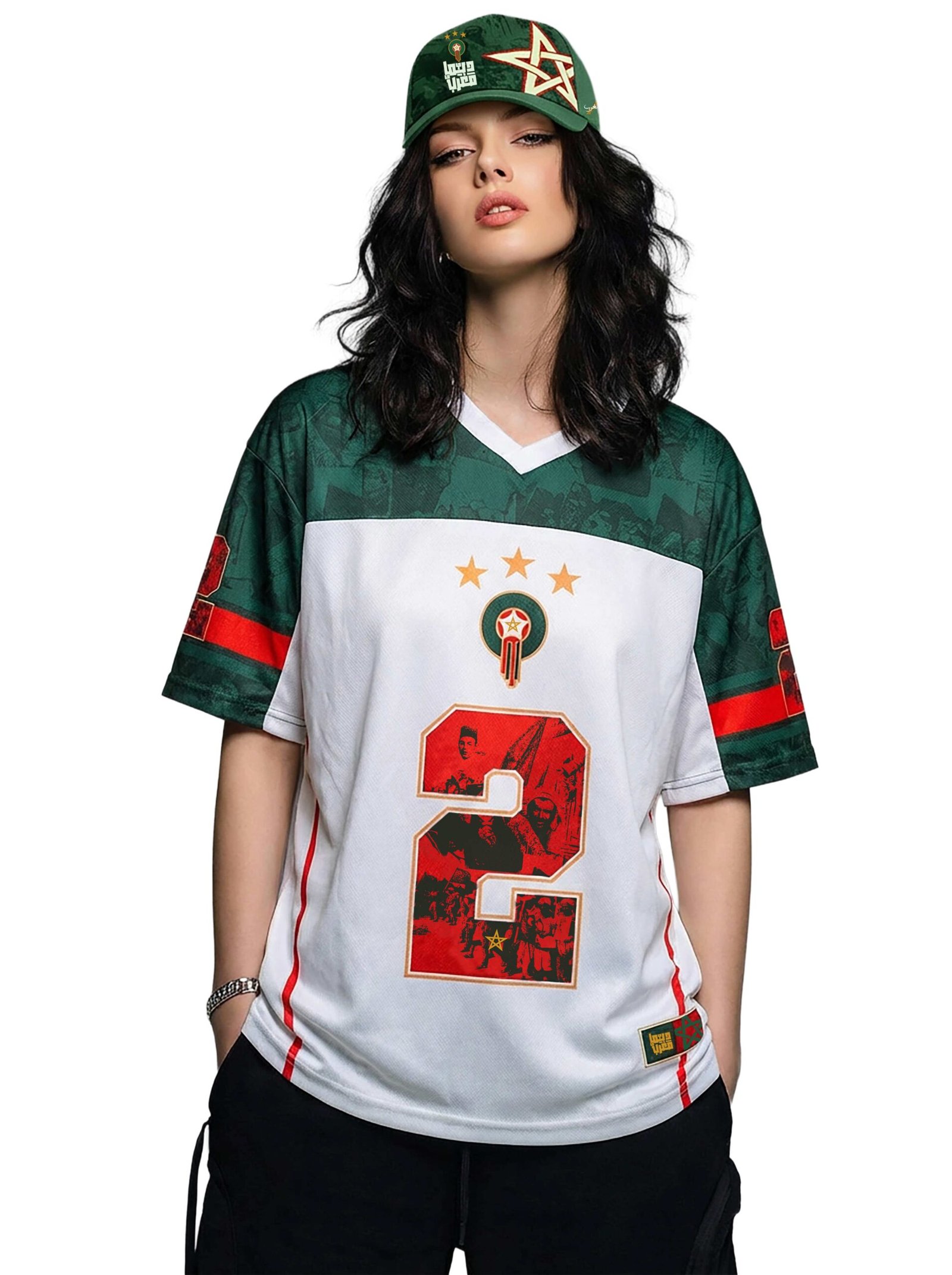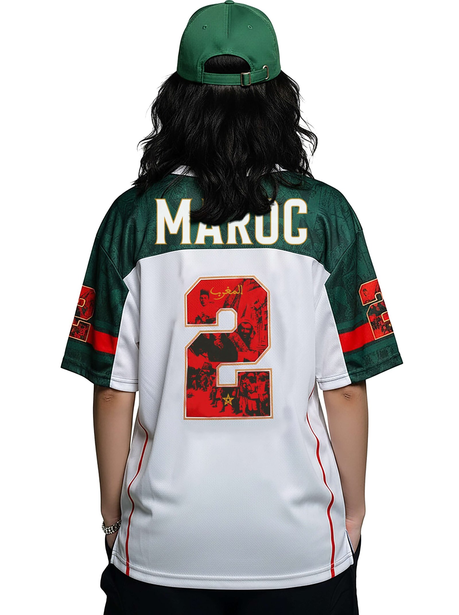 T-shirt oversize ultra confortable en blanch et vert, avec design unique, numéro 2 stylisé et “MAROC” au dos. Coupe ample, tissu doux et look moderne pour un style street et supporter.